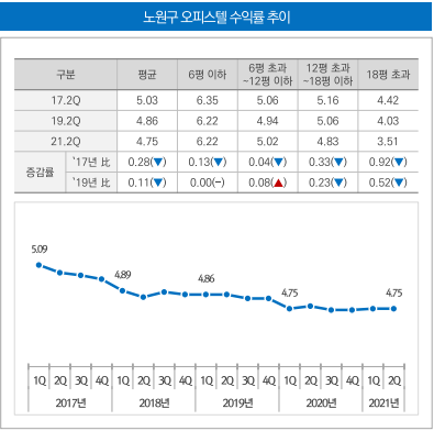 노원구 오피스텔 수익률은 지속적인 하락세에도 서울시 평균대비 높은 수준을 유지하고 있으며 특히 전용면적 6~12평이하 수익률이 높게 나타나고 있습니다.