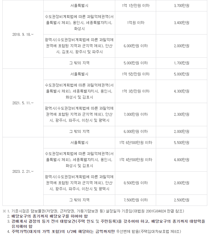 ◆ 아래 구분에 따른 기준금액을 보증금으로 지불한 임차인이 소액임차인에 해당합니다.